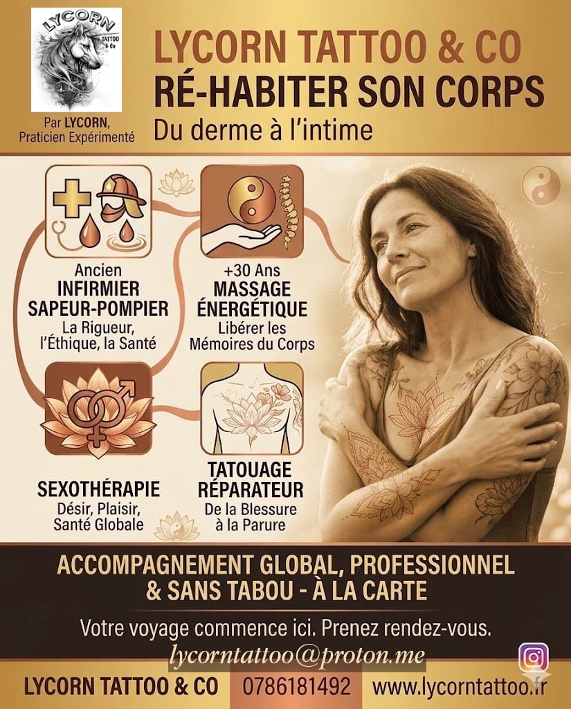 Confiez votre transformation à des mains expertes. Lycorn, infirmier-tatoueur combine compétences médicales et talents artistiques pour créer des tatouages personnalisés, réparateurs et esthétiques qui dissimulent délicatement les cicatrices, transformant chaque marque en une histoire de résilience.